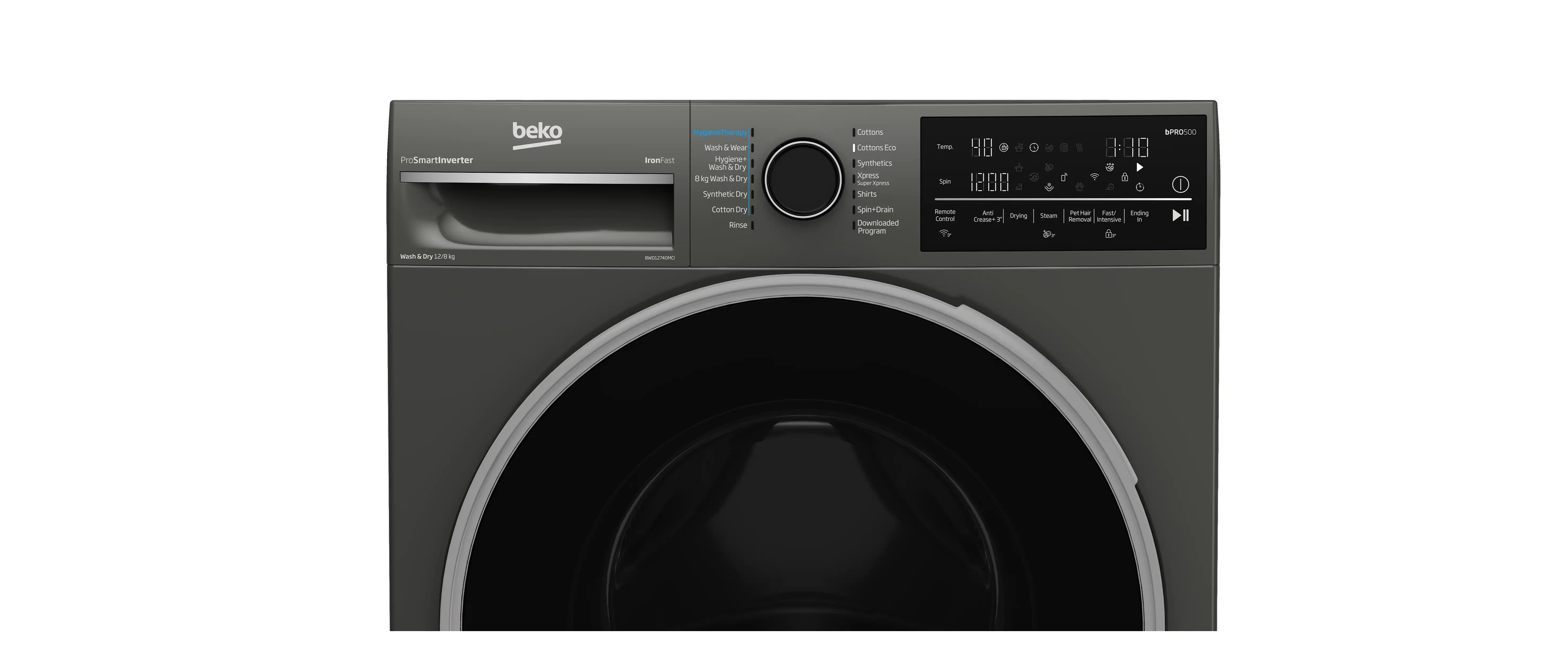 غسالة ملابس فول اتوماتيك بيكو، سعة الغسيل 12 كجم و المجفف 8 كجم، تحميل أمامي، 1400 دورة في الدقيقة، رمادي - BWD12840MCI