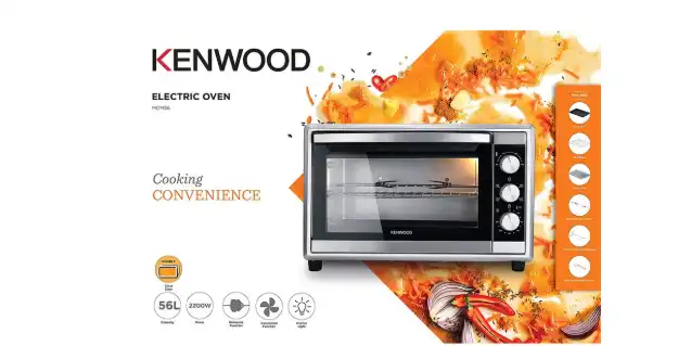 - KENWOOD ELECTRIC OVEN 56L SILVER MOM56.000SS Power 2200 W Capacity 56 LT Silver housing Timer 120 min 6 cooking position Max temperature 250°C Temperature ready light Convection Rotisserie Accessories: enamel bake tray, griddle, handle for remove griddle and rotisserie, rotisserie, crumb tray