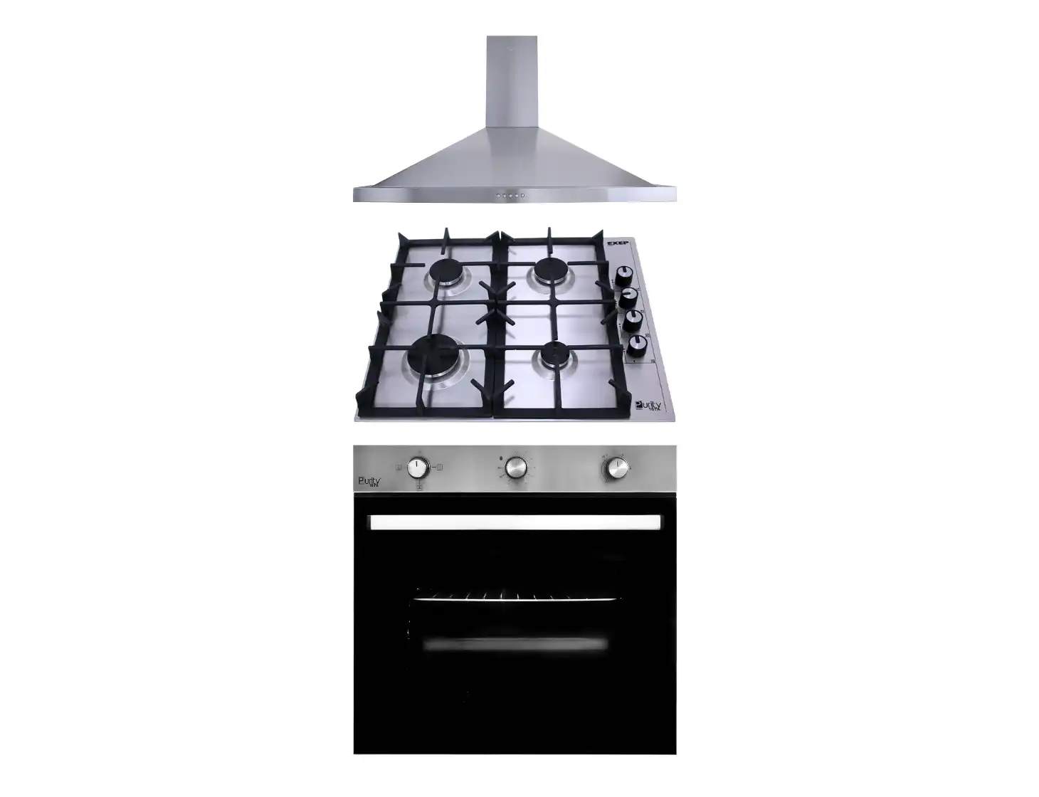 طقم بلت من بيوريتي مسطح بلت ان 4 شعلة غاز، فضى، 60 سم مع شفاط هرمى، 60 سم، فضى مع فرن غاز بشوية، 76 لتر، 60 سم - اسود / فضى PENTO 60+ HPT602S + PT60GG