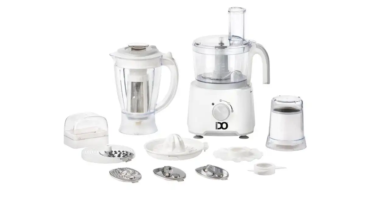- ملحقات متنوعة تشمل: وعاء كبير، شفرة تقطيع، قرص للتقطيع والبشر، أداة للعجن، وأداة للخفق