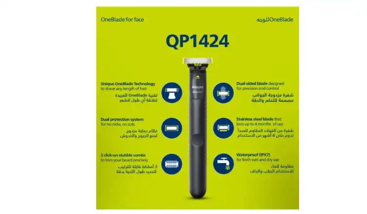 - تتميز ماكينة فيليبس ون بليد بتقنية ثورية مصممة للعناية بالوجه. يمكنها حلاقة أي طول شعر. نظام الحماية المزدوج - طبقة انزلاقية مع رؤوس مستديرة يجعل الحلاقة أسهل وأكثر راحة.