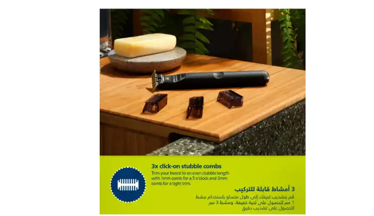 - قم بتشذيب لحيتك للحصول على طول متساوٍ للحية الخفيفة باستخدام أحد مشطي اللحية الخفيفتين المرفقين: 1 مم للساعة الخامسة، و3 مم لتشذيب دقيق.