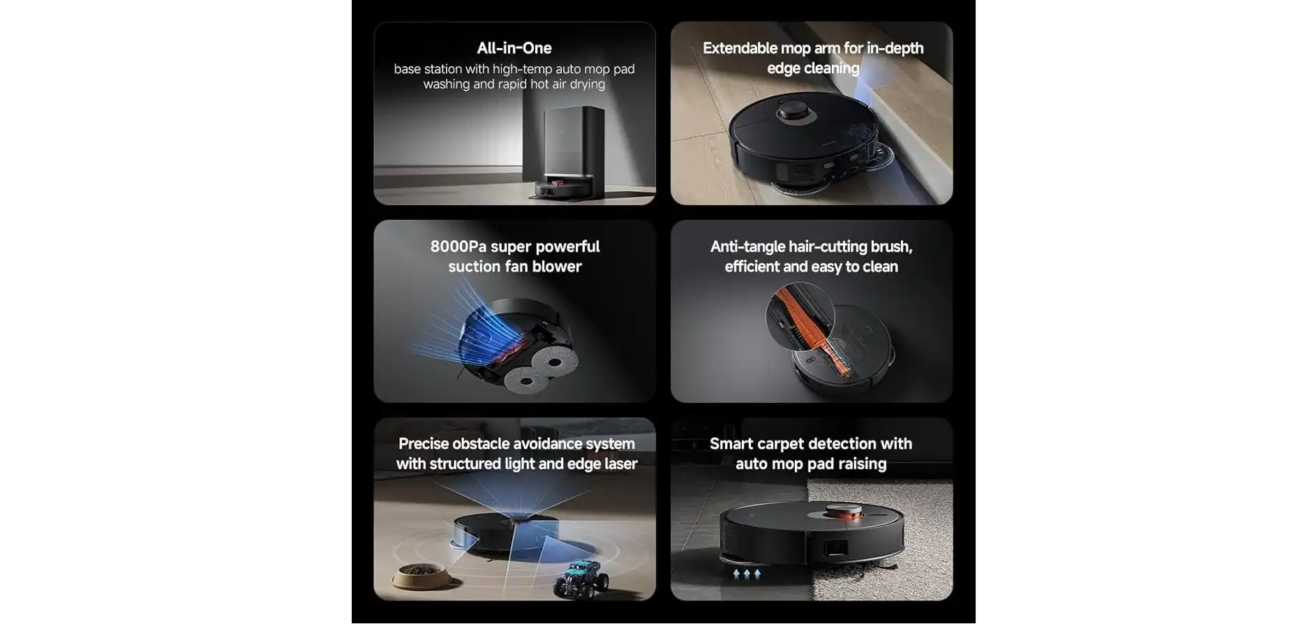 - ملاحة متقدمة: يستخدم نظام ملاحة بالليزر LDS ومستشعرات الضوء الهيكلي لرسم خرائط دقيقة وتجنب العقبات.