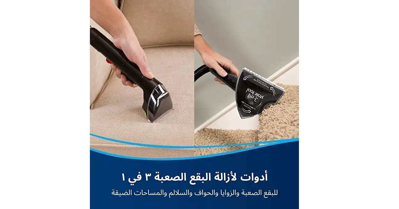 - أداة مثالية متعددة الوظائف: يتضمن الجهاز أداة البقع الصعبة للبقع الصعبة على مختلف المفروشات وحتى فرش السيارات، وأداة السلالم 3 في 1 المصممة لتنظيف الزوايا والحواف والسلالم، وأداة الشقوق للمساحات الضيقة مثل الشقوق بين الأريكة أو حواف السجادة على طول المساحة المزخرفة.