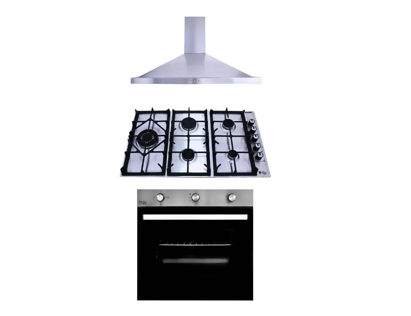 Bundle of Purity 5 Burners Gas Built-In Hob, Silver, 90 cm With Pyramid Hood, 90 cm, Silver with Gas Oven with Grill, 76 Litres, 60 cm - Black / Silver