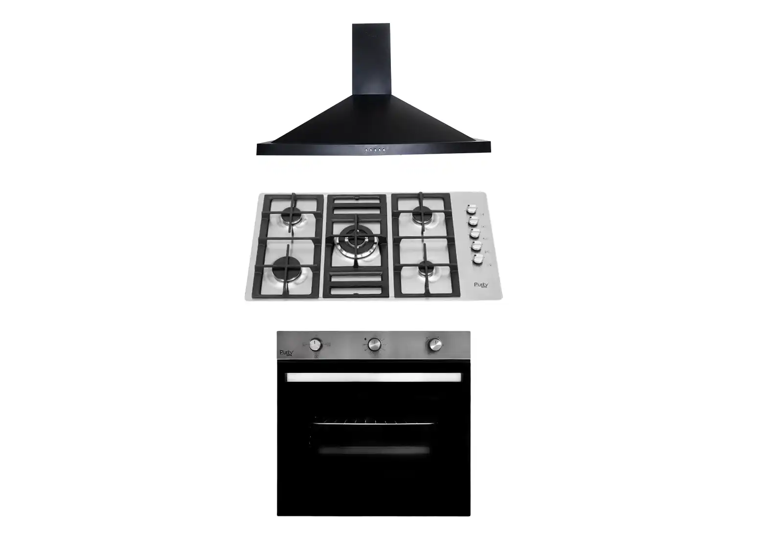 Bundle of Purity 5 Burners Gas Built-In Hob, Stainless Steel, 90 cm With Pyramid Hood, 90 cm, Black with Gas Oven, 76 Litres, 60 cm - Black