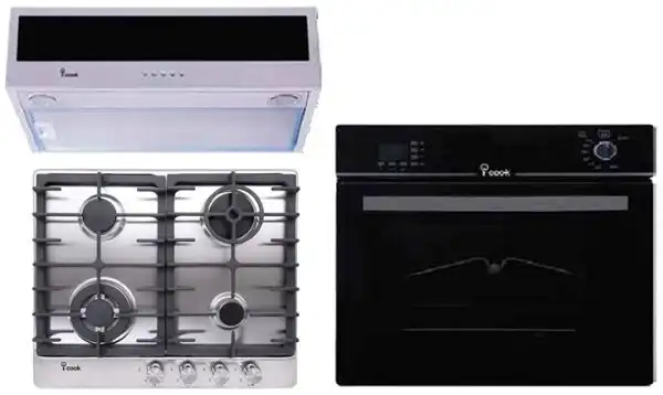 i-Cook Bundle of 4 Burners Gas Built-In Hob, Stainless Steel, 60 cm - BH5060S With Hood Without Chimney, 60 cm, Stainless Steel - C60CZX With Digital Gas Oven With Grill, 70 Litres, Black -