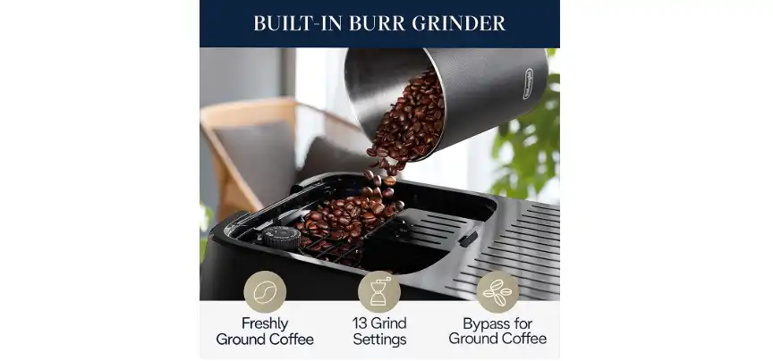 - 13 Coffee Grinding Settings: The built-in grinder ensures your coffee is always made with fresh beans, preserving maximum flavor and aroma.