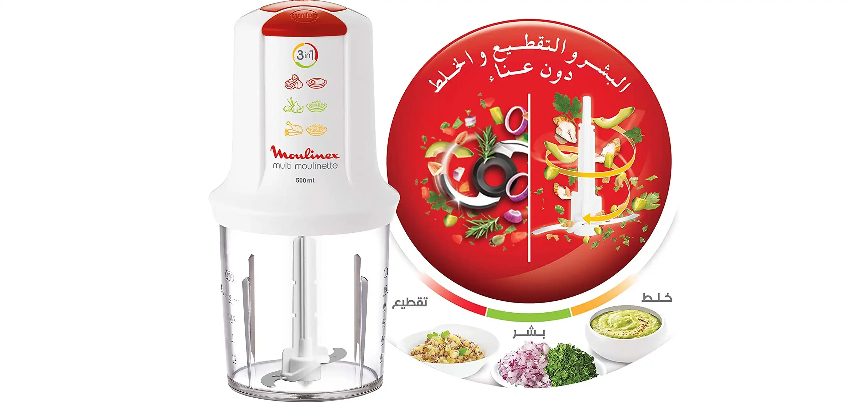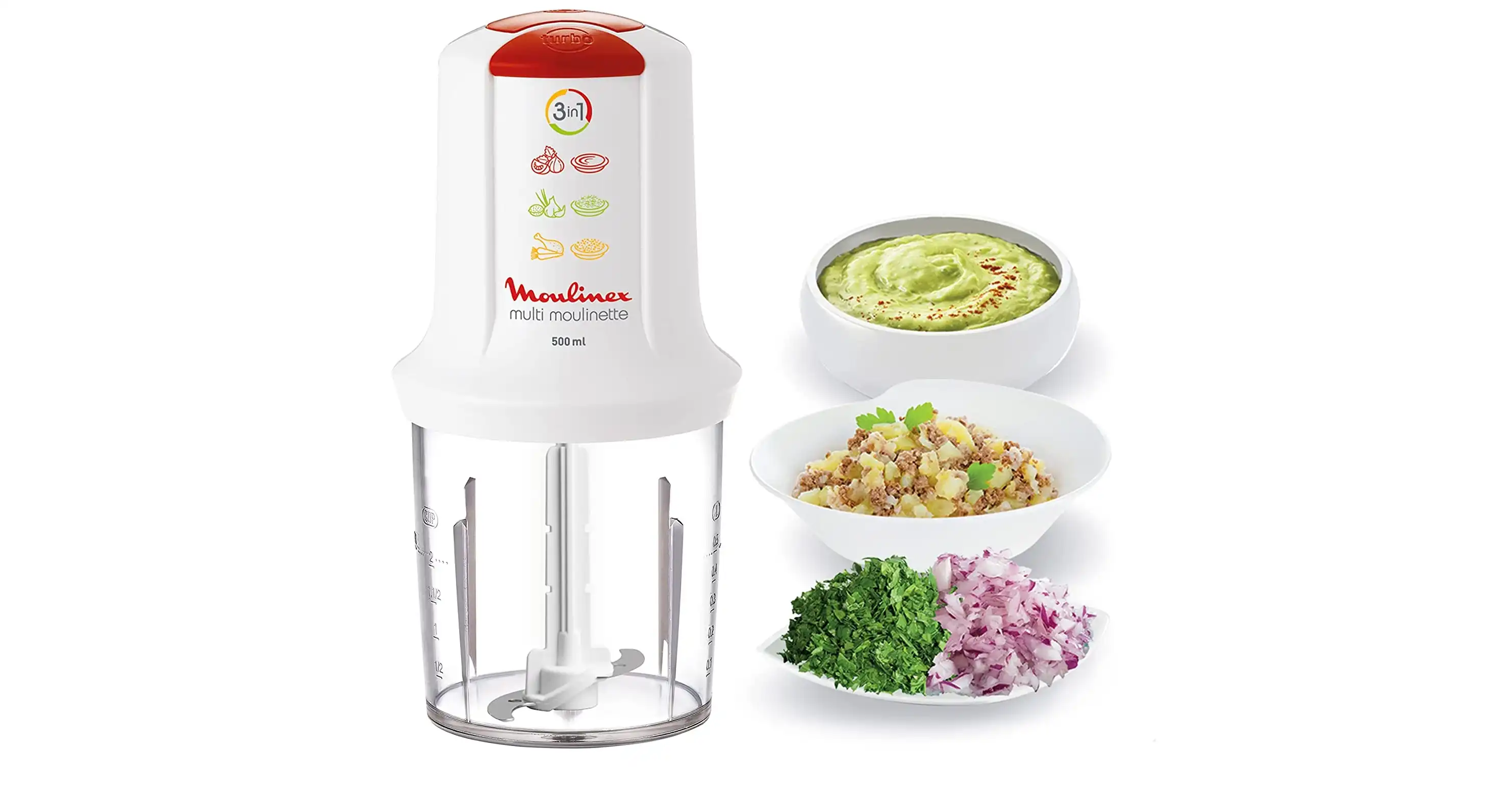 Moulinex Multi Moulinette Chopper, 500 Watt, 500 ML Chopper. Mince, chop & mix your ingredients ! The Multi Moulinette has 1 speed and a turbo function for a perfect result adapted to every preparation. Its large bowl will permit you to measure exactly your solid ingredients up to 300g. You can also count on the leak tight bowl in order to make all kind of semi liquid mixtures up to 500ml. With Multi Moulinette you can chop different types of ingredients garlic, onions, herbs, sauces, etc. due to the enhanced 3-in-1 versatility. Multi Moulinette has a removable stainless steel blades for easy cleaning. View your preparations easily thanks to the transparent bowl. Multi Moulinette is easy storage thanks to compact design.