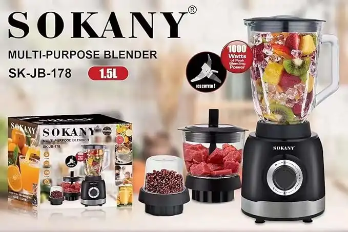 Sokany 3×1 Blender with Grinder and Chopper, 1000-Watt, 1.5 liter, Stainless - SK-178
