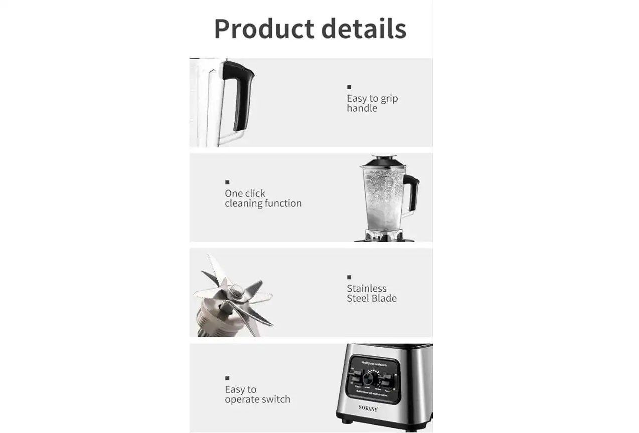 Sokany Blender with Grinder, 6000-Watt, 2.5 liters, Stainless Steel - sk-999