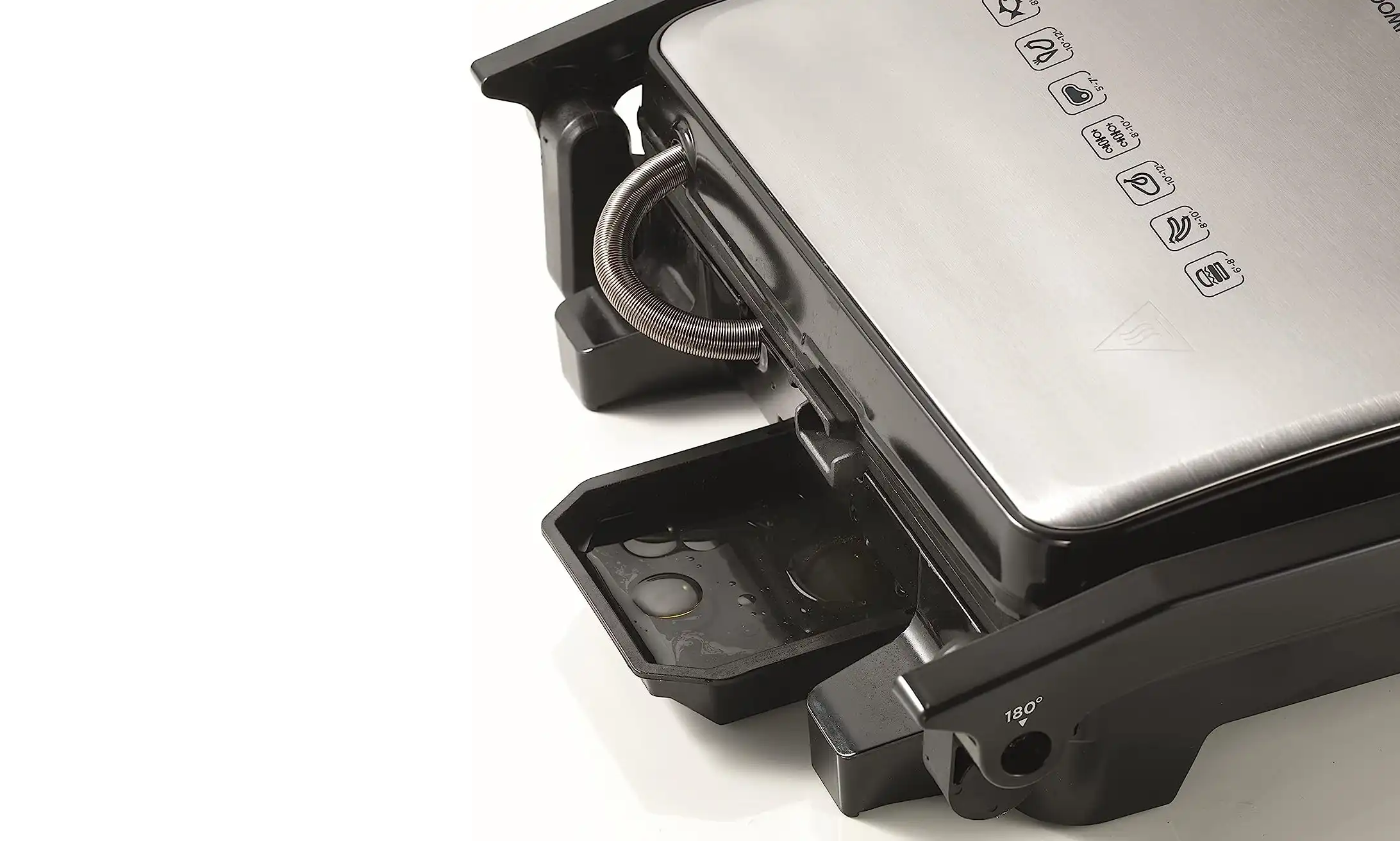 - Oil Drain Channels. Spatula And Oil Drip Cups. Cord Storage.