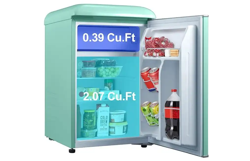 - Compact Design: This mini bar refrigerator features a sleek and stylish appearance with a vibrant turquoise colour that adds a touch of retro charm to any space.