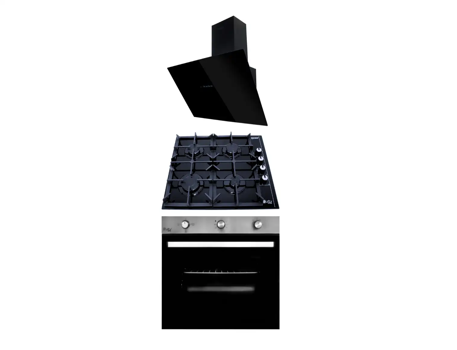 طقم بلت من بيوريتي مسطح بلت ان 4 شعلة غاز، أسود، 60 سم مع شفاط ديكوريتف ، 60 سم، أسود مع فرن غاز بشوية، 76 لتر، 60 سم - اسود / فضى