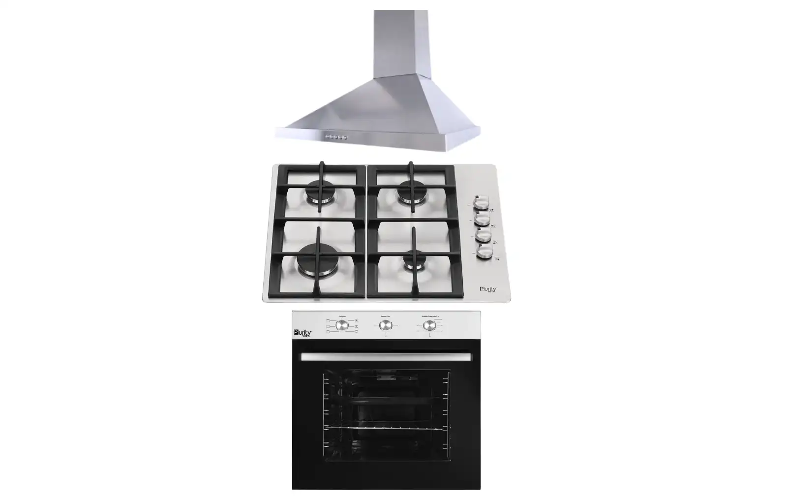 طقم بلت من بيوريتي مسطح بلت ان 4 شعلة غاز، فضي، 60 سم مع شفاط هرمي، 60 سم، فضى مع فرن كهرباء، 65 لتر، 60 سم - اسود / فضى