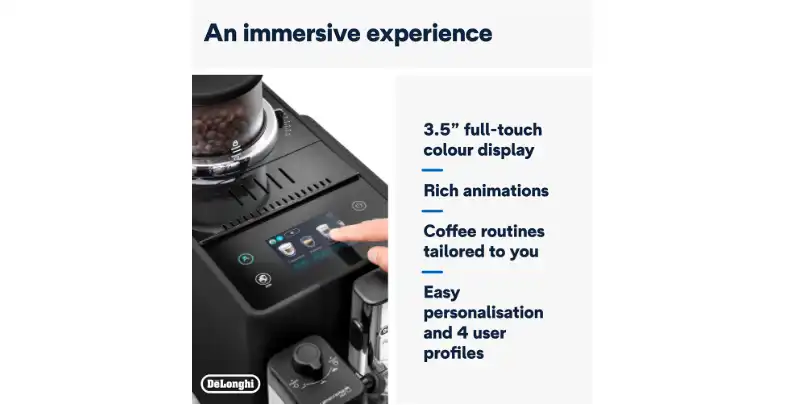 - شاشة ملونة TFT سهلة الاستخدام مقاس 3.5 بوصة مع رسوم متحركة غنية وخيارات قهوة مصممة خصيصًا لك: 16 مشروبًا بلمسة واحدة، من الإسبريسو إلى اللاتيه منزوع الكافيين.