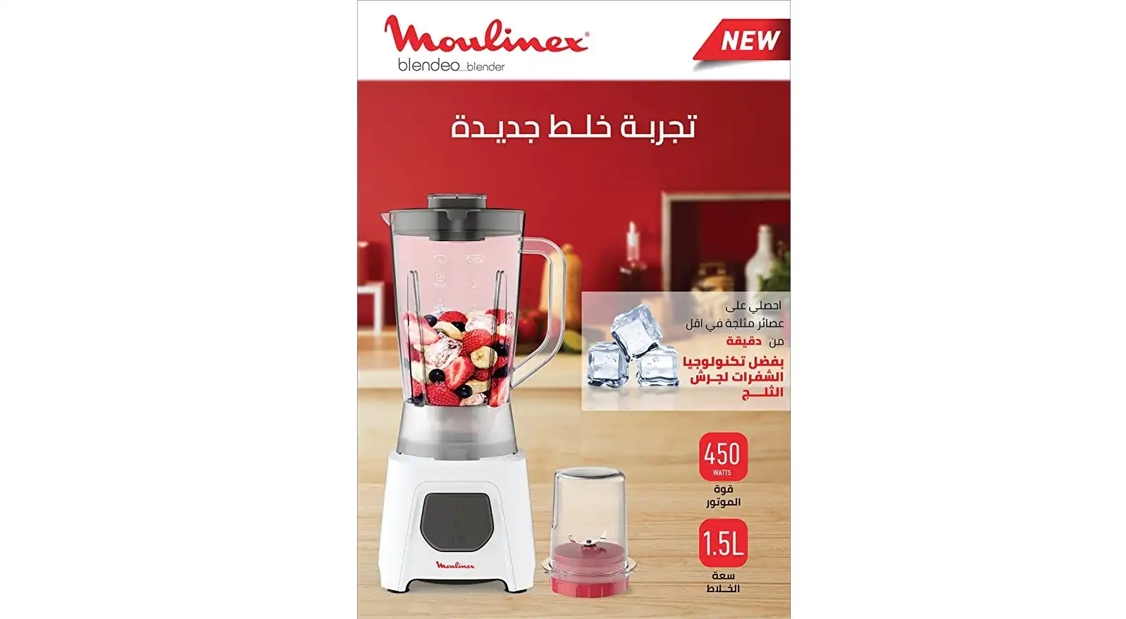 خلاط بلينديو من مولينكس مع مطحنة، 1.5 لتر، 450 وات، استمتع بمزج سريع وسهل. يتميز هذا الخلاط المريح بتقنية ICE CRUSH التي تحول الثلج إلى ثلج في أقل من دقيقة واحدة ، للحصول على مشروبات مجمدة لذيذة في أقل من الوقت.يأتي خلاط Blendeo بمحرك 450 واط ، ووعاء سعة 1.5 لتر مع علامات قياس مريحة وملحق طحن مع الفولاذ المقاوم للصدأ من الداخل لتحقيق الكفاءة المثلى.تأتي السلامة أولاً ، فلدي Blendeo تقنية تهوية محرك محددة لمنع ارتفاع درجة الحرارة ، بالإضافة إلى الصمامات القابلة لإعادة الضبط .استكشف أقصى قدر من الاستقرار أثناء مزج المكونات الصلبة أو سحق مكعبات الثلج بفضل أقدام الشفط المتوفرة.يقدم Blendeo أداء خلط رائعًا يومًا بعد يوم.نتائج الخلط المخصصة هي نسيم أيضًا ، عبر زر مريح 1 سرعة 1 وظيفة النبض : تحكم مثالي كل هذا في تصميم قوي وعملي مع وعاء خلط كبير الحجم وكوب مدمج للأمان والراحة تراجع الجرعات.