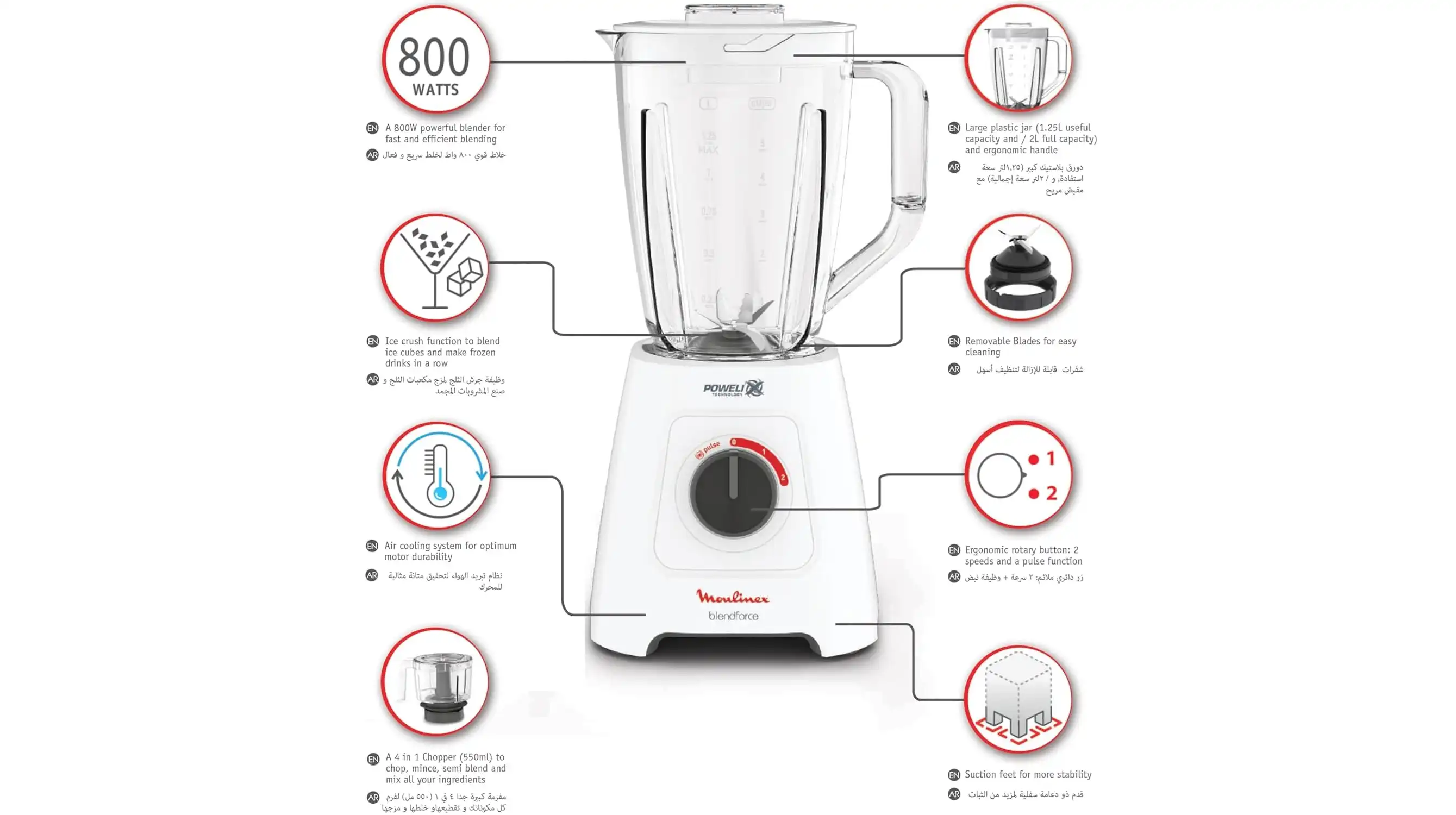 - أحصل علي نتائج أسرع و أكثر سلاسة لتحضيراتك اليومية مع خلاط بليند فورس من مولينكس. استمتع بالخلط السريع والسهل بفضل محرك بقوة 800 واط للأداء العالي. يتميز هذا الخلاط القوي بشفرات بتكنولوجيا POWELIX لإداء أسرع بنسبة 30% و نتائج أكثر نعومة. من خلال الجمع بين القوة و المتانة بفضل ثلاث ركائز هي الشفرات الحادة و حركة الشفرات الدوامة و ذوايا القطع المحسنة . التحكم في نتائج الخلط أصبح سهلا , أستمتع بالتحكم السهل عن طريق زر دائري مريح ذو سرعتين + وظيفة النبضات للوصول للقوام المرغوب. كل هذا في تصميم قوي و عملي مع دورق خلط كبير الحجم .قم بإعداد مجموعة متنوعة من الوصفات بفضل كبة اكس ال (4 في 1) بسعة 550 مل عن طريق تقطيع و فرم و خلط و مزج جميع مكوناتك .كوب قياس لمعايرة و إضافة المكونات بدقة. استمتع بالخلط و المزج بأمان مع نظام تبريد هواء مبتكر يمنع ارتفاع درجة حرارة الماتور لتحقيق متانة مثالية."