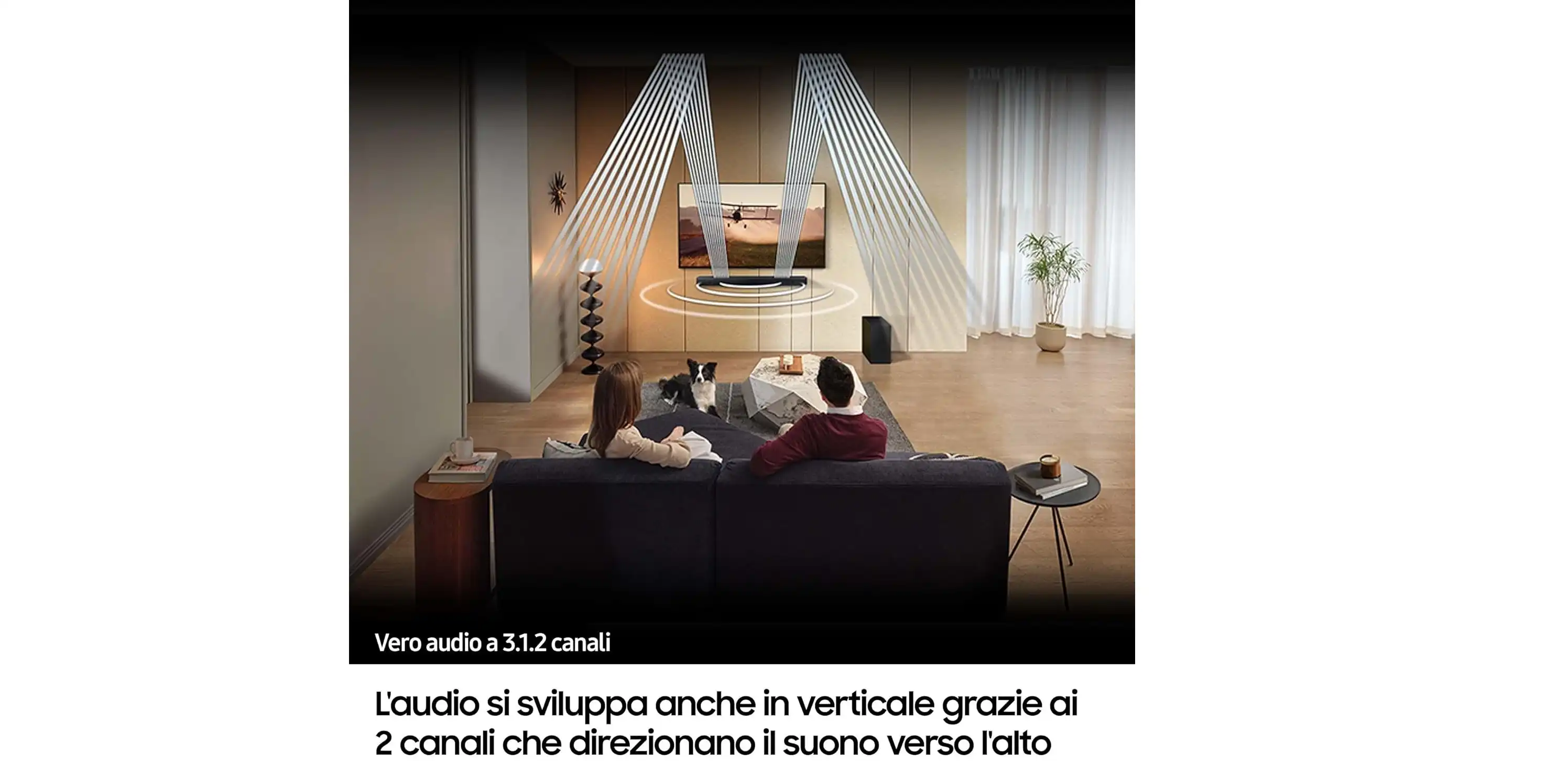 - صوت 3.1.2 قناة: 3 قنوات ، 1 مضخم صوت و 2 مكبر صوت لخلق تأثير صوتي ديناميكي ، صوت متوازن تماما صممه مختبر الصوت من سامسونج ليمنحك تجربة استماع سينمائية
