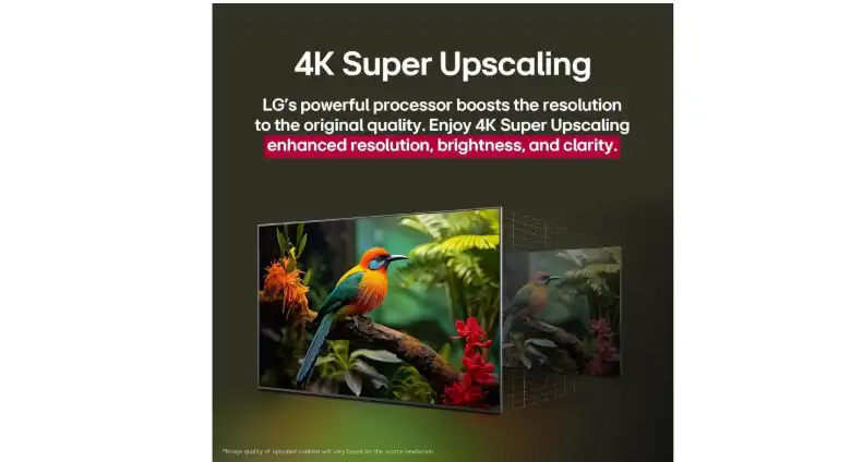 - نظام webOS مع AI Magic Remote يتيح لك البحث الذكي AI Search، والروبوت الذكي AI Chatbot، والمساعد الذكي AI Concierge، بينما يقوم برنامج webOS Re:New بتحديث الجهاز سنويًا لمدة 5 سنوات.