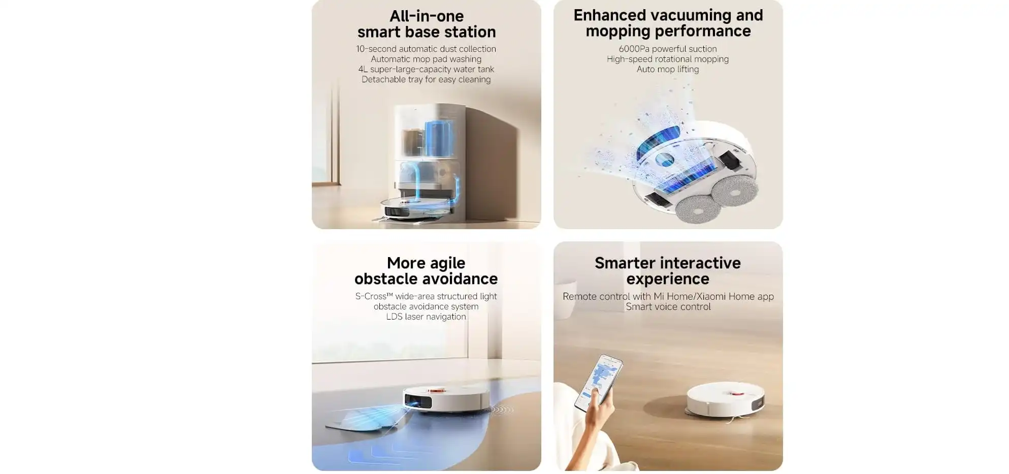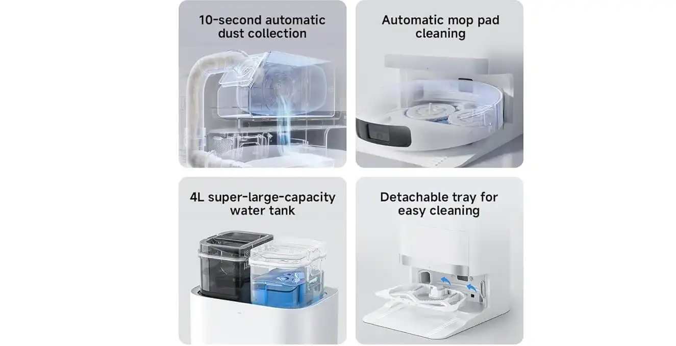 - قاعدة ذكية للكل في واحد: تتضمن المكنسة قاعدة شحن ذكية تقوم بتنظيف الممسحة تلقائيًا بعد كل استخدام، مما يضمن نظافتها وجاهزيتها للجولة التالية.