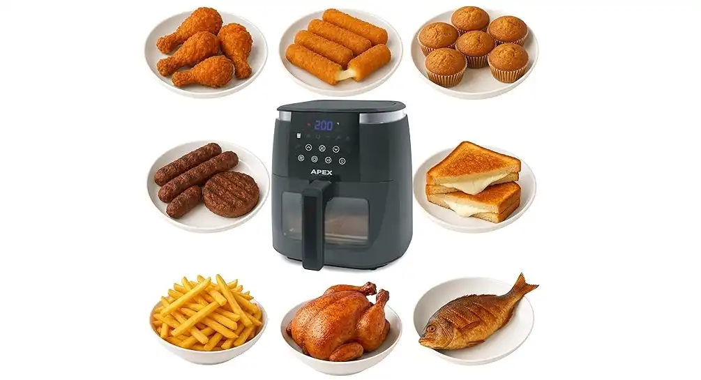Apex Air Fryer, 6.5L Capacity, Transparent Front & Interior Lighting, Touch Screen, Timer & Sound Alarm, Non-Stick Basket, Energy Saving – Black