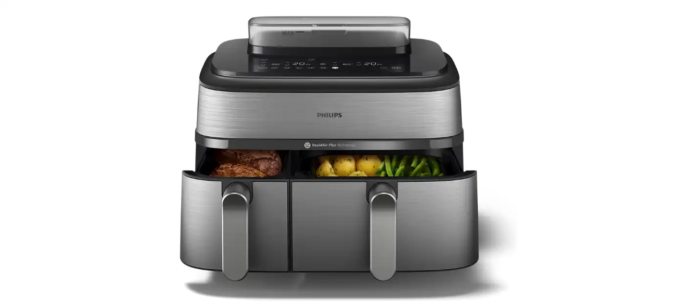 Two baskets for frying, baking, roasting, and grilling, with one also equipped for steaming. Enjoy perfectly cooked meals with RapidAir Plus and Air Steam Technology