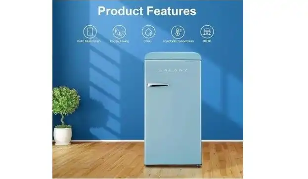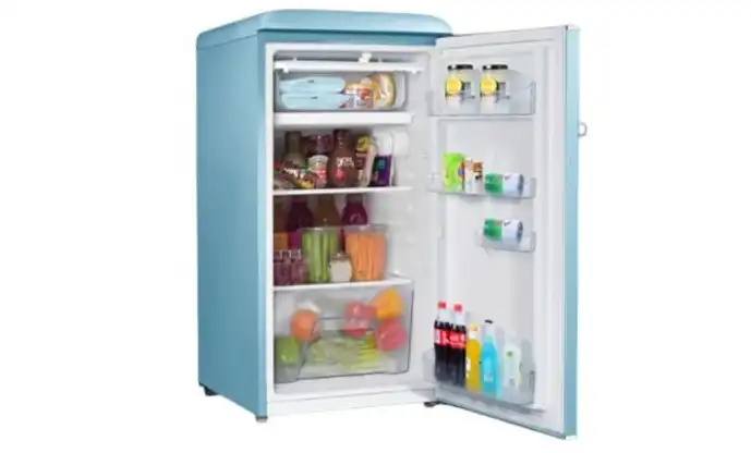- Compact Design: This mini bar refrigerator features a sleek and stylish appearance with a vibrant blue colour that adds a touch of retro charm to any space.