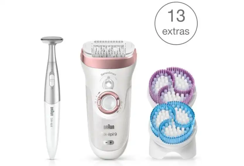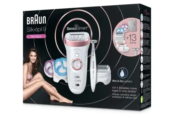 Braun Silk-épil 9 SkinSpa SensoSmart™ is the world's 1st smart epilator. The Silk-épil SkinSpa is a complete 4-in-1 epilation, exfoliation and skin care system. The epilator includes SensoSmart pressure sensor technology to guide your epilation and remove even more hair in one stroke. Braun’s best Wet & Dry epilator comes with 2 body exfoliation brushes to help reduce ingrown hairs. With 13 extras, including a shaver and trimmer cap for sensitive areas, bikini trimmer, skin contact cap, facial cap, pouch, and stand.
